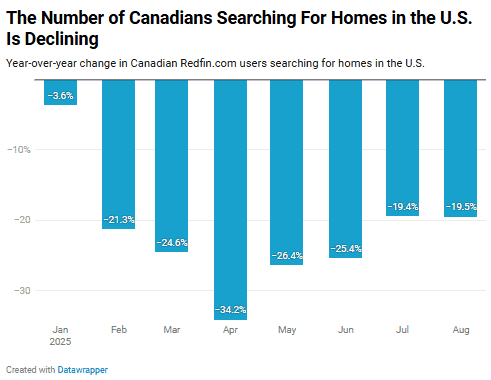 The number of Canadian Redfin.com users searching for homes to buy or rent in the U.S. dropped 19.5% year over year in August. For comparison, the total number of prospective buyers and renters searching on Redfin.com declined, too, but by a fraction of the amount.
