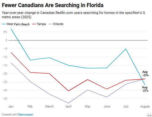 Canadian searches for U.S. homes dropped off when the White House announced steep tariffs on Canadian goods in the spring. The decline is especially steep in West Palm Beach, FL, a popular second-home destination for snowbirds.