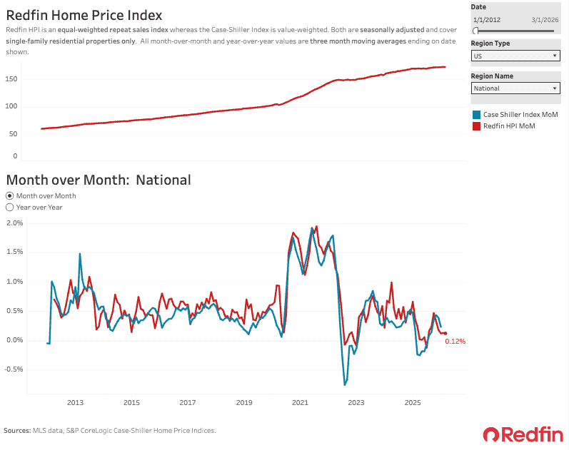 This is according to the Redfin Home Price Index (RHPI), which uses the repeat-sales pricing method to calculate seasonally adjusted changes in single-family home prices. The RHPI measures how sale prices of homes have changed since their previous sale—similar to the S&P Cotality Case-Shiller Home Price Indices—but is reported about a month earlier. March data covers the three months ending March 31, 2026. Read the full RHPI methodology here.