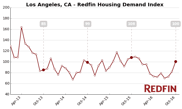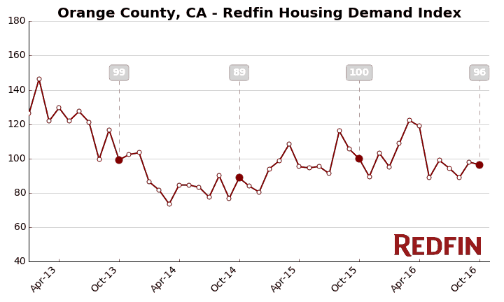 The Redfin Housing Demand Index, based on thousands of Redfin customers requesting home tours and writing offers, declined 3.5 percent from September to a seasonally-adjusted level of 100 in October.