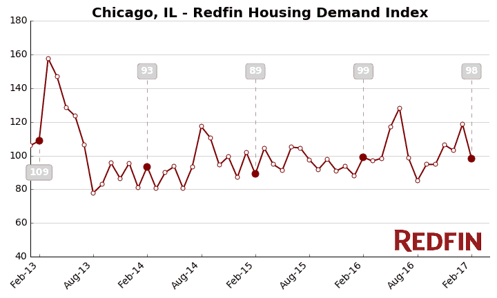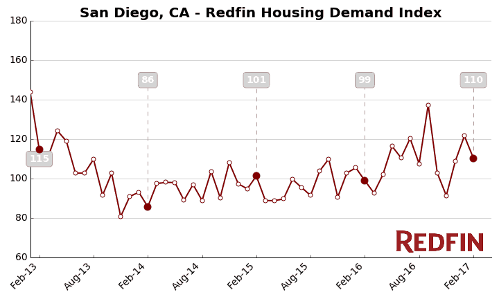 The Demand Index is based on thousands of Redfin customers requesting home tours and writing offers. A level of 100 represents the historical average for the three-year period from January 2013 to December 2015.