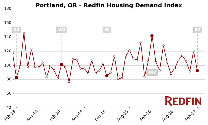 The Portland-area Demand Index level was at 92 in February, down 32.8 percent compared to this time last year. In February, 20.7 percent fewer homebuyers were touring and 42.9 percent fewer buyers writing offers than the previous February.