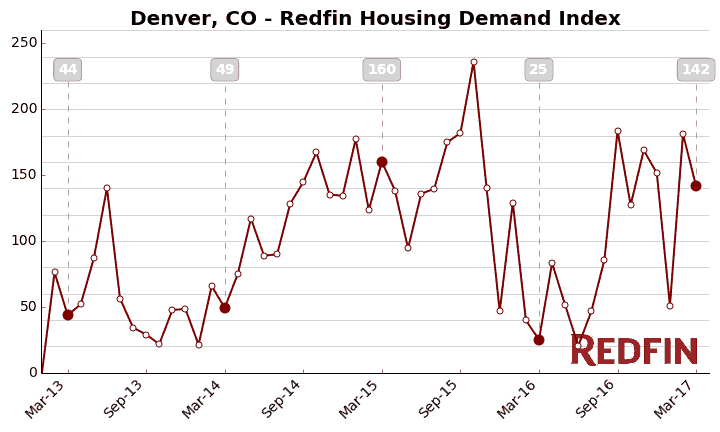 The Demand Index is based on thousands of Redfin customers requesting home tours and writing offers. A level of 100 represents the historical average for the three-year period from January 2013 to December 2015.