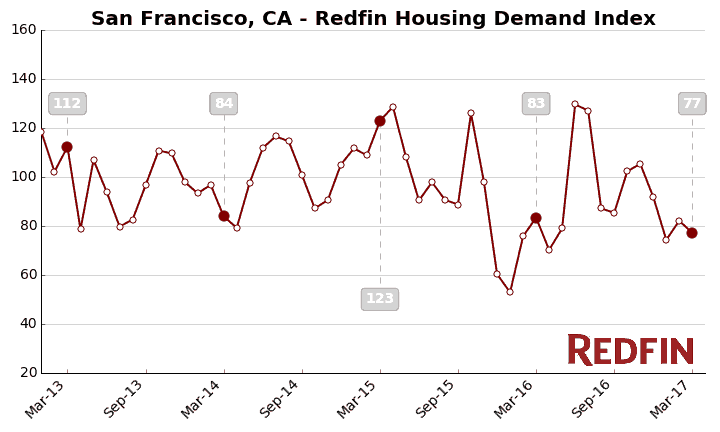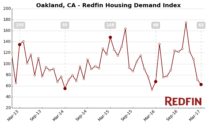 The Oakland-area Demand Index was at 62 in March, sharply down from a four-year peak of 175 last November. Homebuyers were writing a seasonally adjusted 28.4 percent fewer offers in March than in February.
