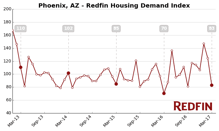 The Redfin Housing Demand Index decreased 13.9 percent from February, to a seasonally adjusted level of 108 in March. While homebuyer demand has cooled from its record high of 132 in January, this was still the strongest March since 2013, when the Demand Index registered just one point higher at 109.