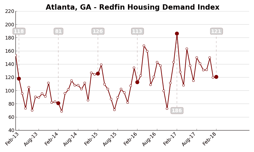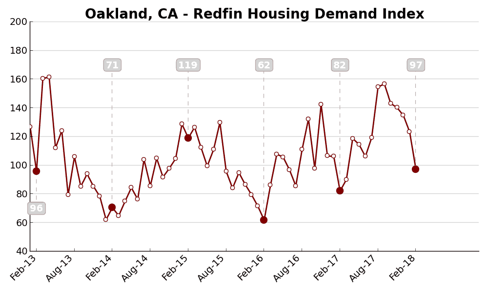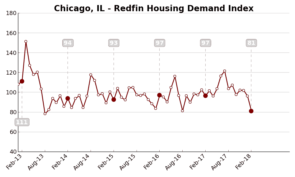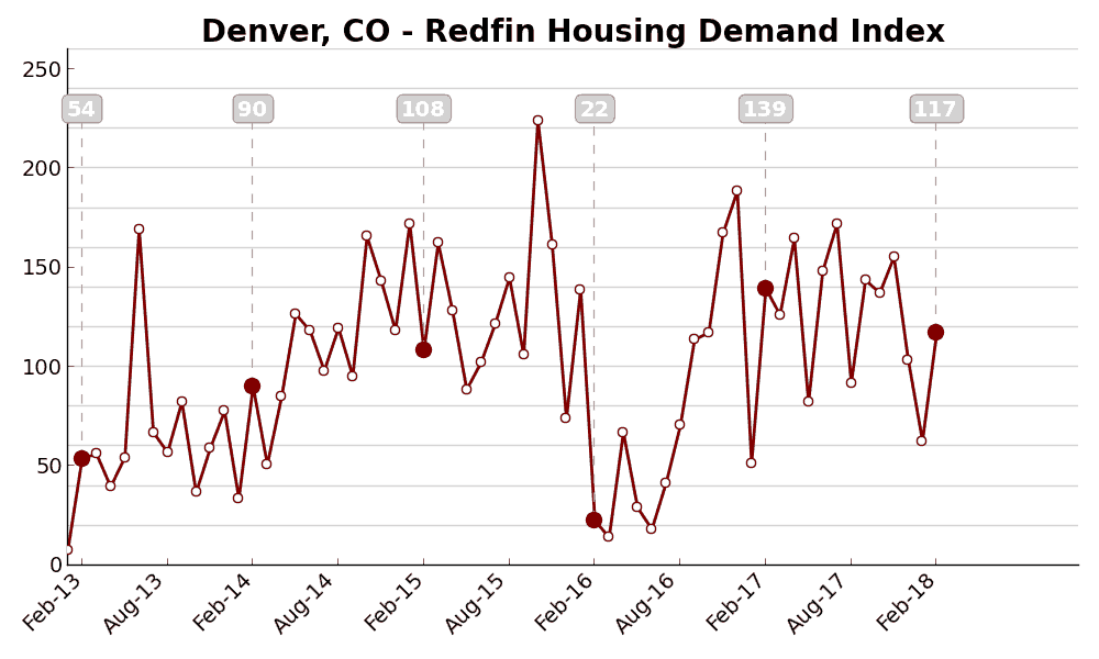 The Demand Index is based on thousands of Redfin customers requesting home tours and writing offers. The Demand Index is adjusted for Redfin’s market share growth. A level of 100 represents the historical average for the three-year period from January 2013 to December 2015.
