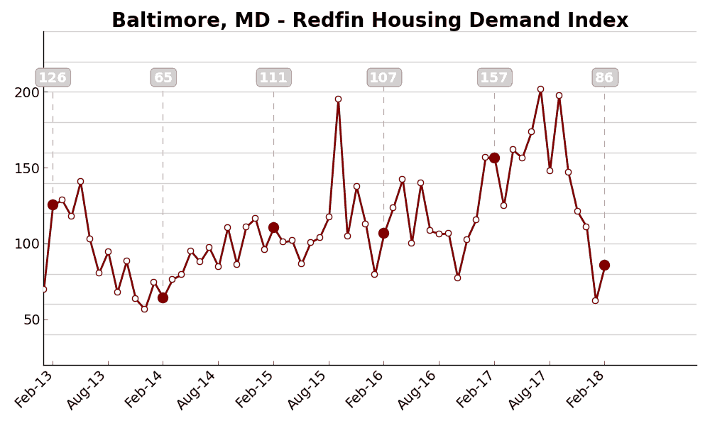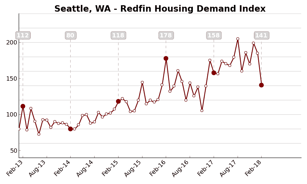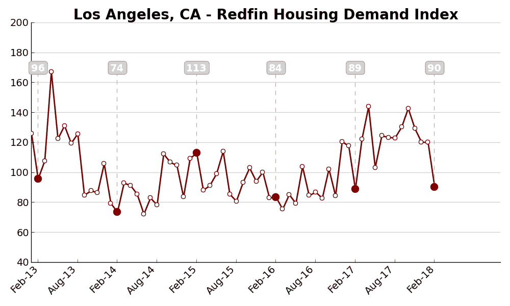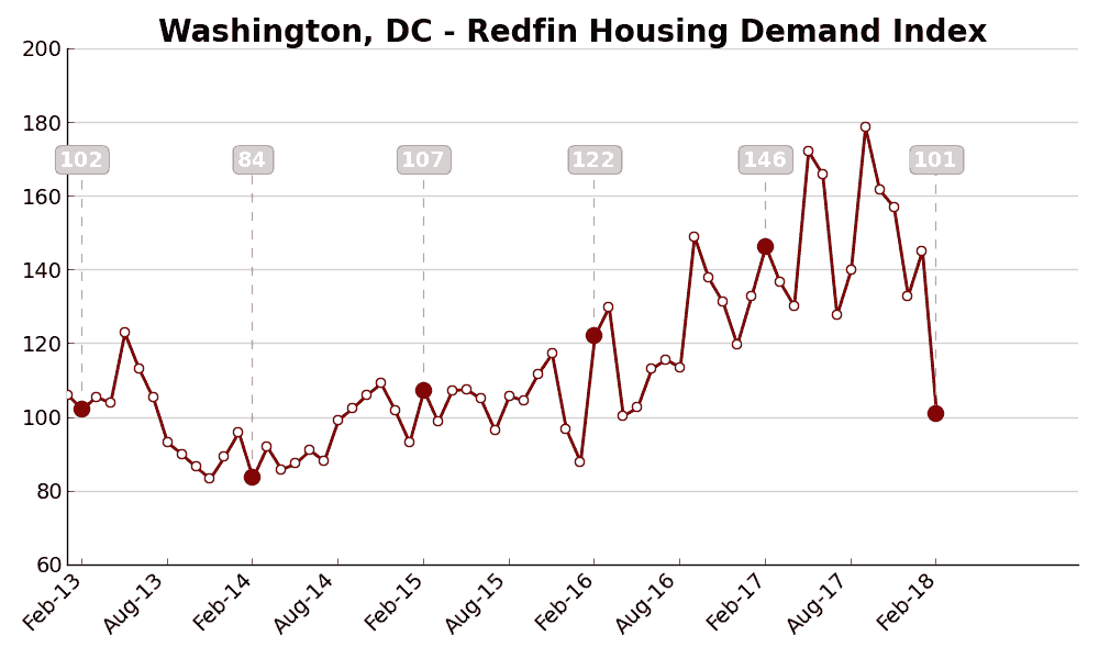 Looking at year-over-year comparisons, the Demand Index declined 6.5 percent from February 2017. The number of buyers requesting home tours actually increased 2.9 percent, while the number making offers fell 20.1 percent.