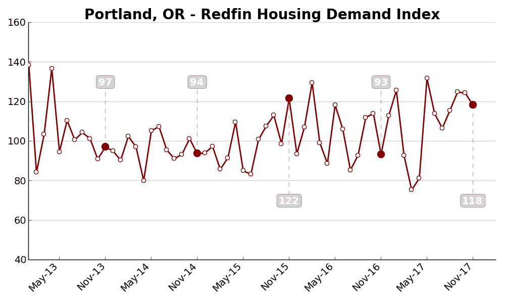 The Redfin Housing Demand Index fell 6.2 percent from 136 in October to 127 in November. The Demand Index is based on thousands of Redfin customers requesting home tours and writing offers. The seasonally adjusted number of buyers requesting home tours fell slightly by 1.9 percent, while the number making offers fell 14.7 percent.