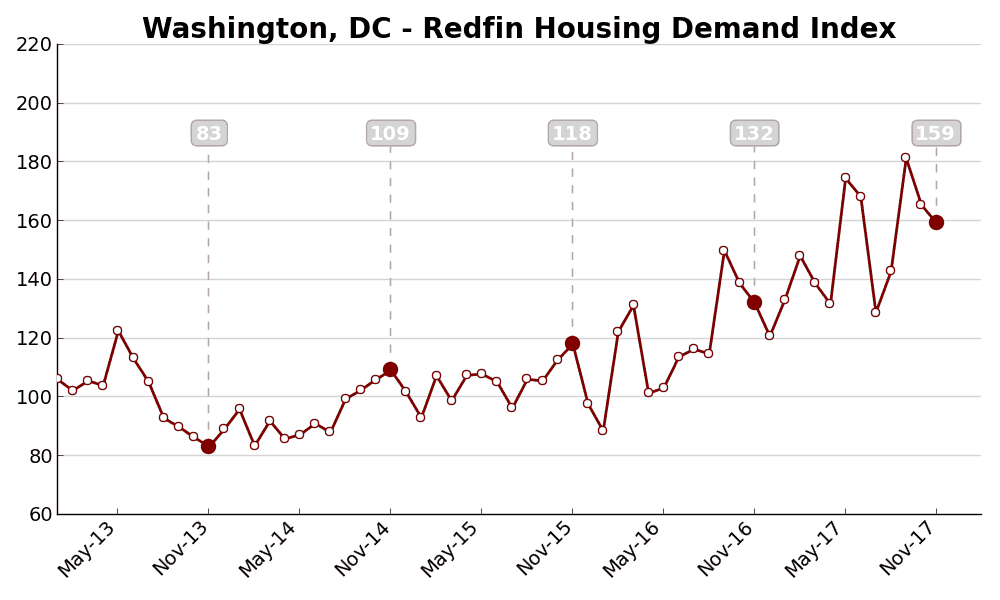 The Demand Index is adjusted for Redfin’s market share growth. A level of 100 represents the historical average for the three-year period from January 2013 to December 2015.