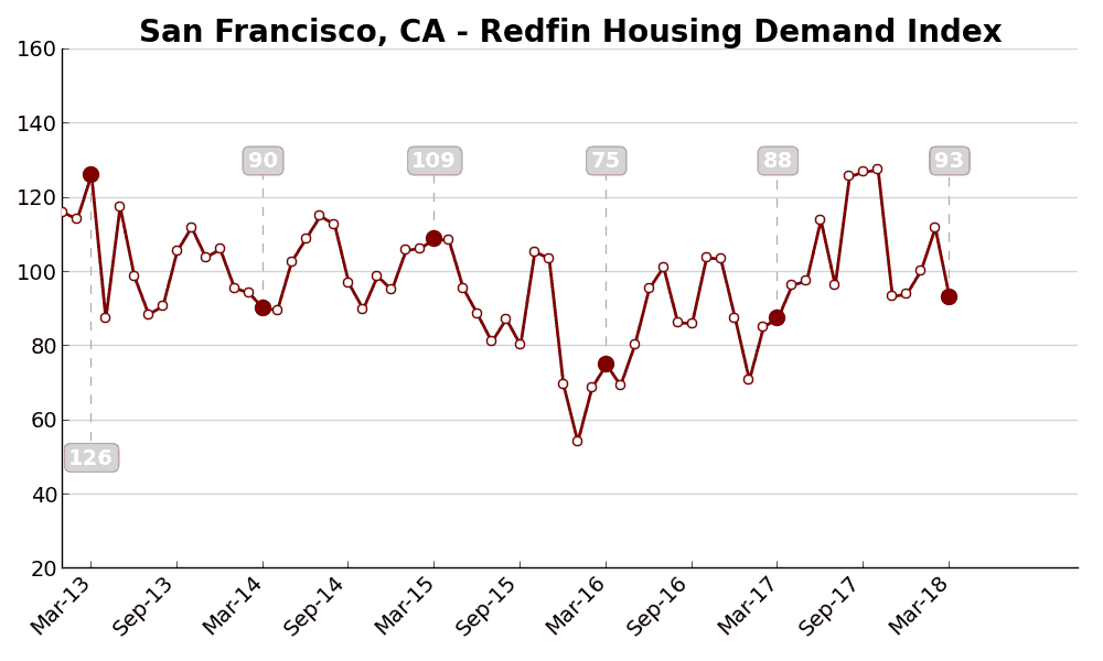 The Demand Index is based on thousands of Redfin customers requesting home tours and writing offers. The Demand Index is adjusted for Redfin’s market share growth. A level of 100 represents the historical average for the three-year period from January 2013 to December 2015.