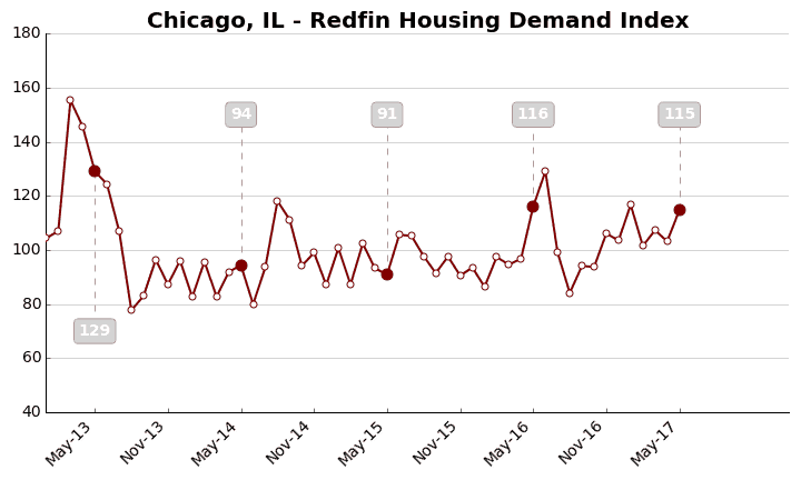 The Demand Index is based on thousands of Redfin customers requesting home tours and writing offers. A level of 100 represents the historical average for the three-year period from January 2013 to December 2015.