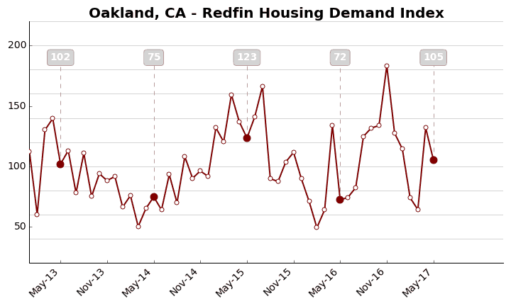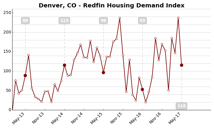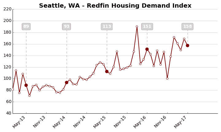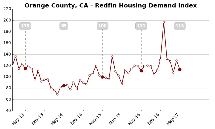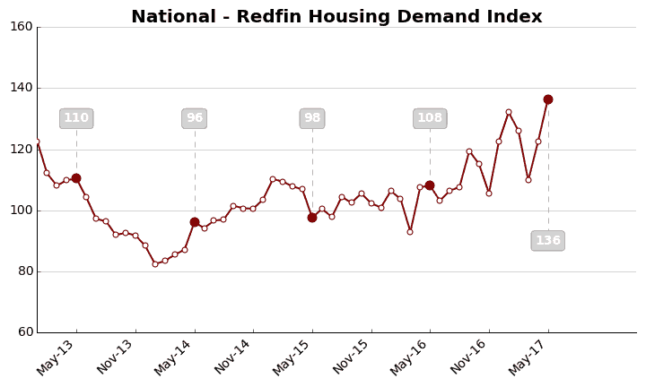 The Redfin Housing Demand Index increased 11.3 percent from April to a seasonally adjusted record level of 136 in May. This was the highest level of homebuyer demand recorded since Redfin began tracking this data in January 2013.