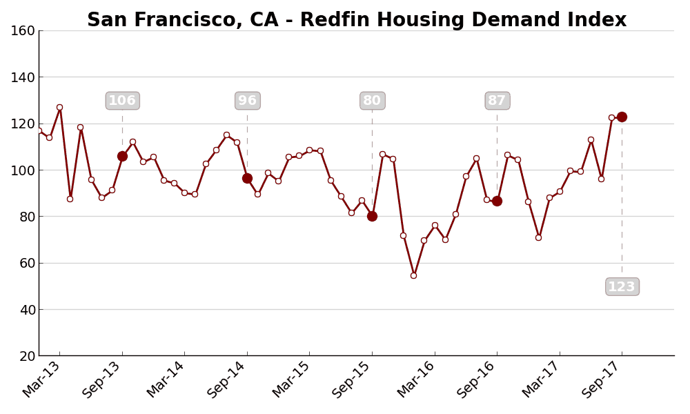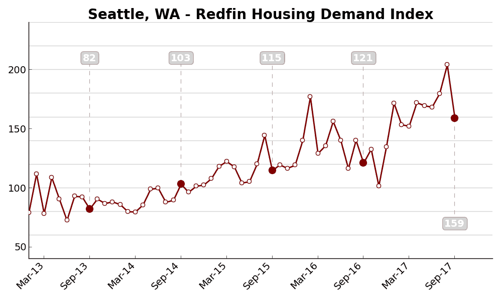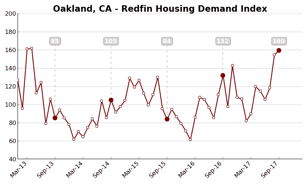 The Demand Index is based on thousands of Redfin customers requesting home tours and writing offers. A level of 100 represents the historical average for the three-year period from January 2013 to December 2015.