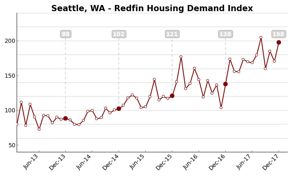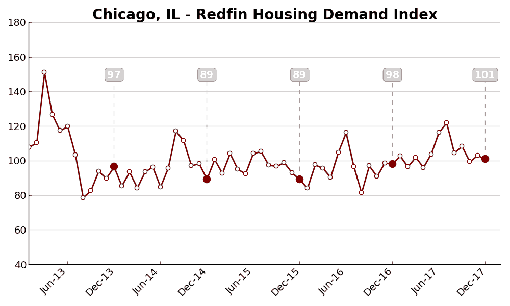 The Redfin Housing Demand Index remained nearly flat into the end of 2017, falling just 0.6 percent from 128.3 in November to 127.6 in December. The seasonally adjusted number of buyers requesting home tours fell by 3.4 percent while the number making offers fell 1.8 percent from November.
