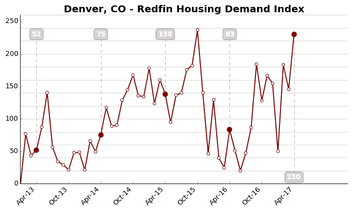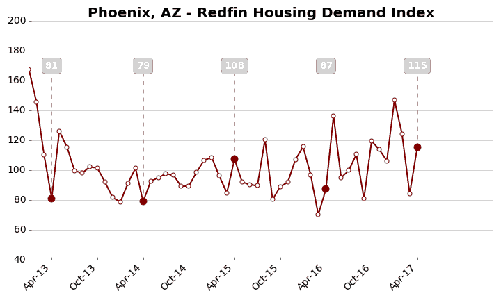 The Demand Index is based on thousands of Redfin customers requesting home tours and writing offers. A level of 100 represents the historical average for the three-year period from January 2013 to December 2015.