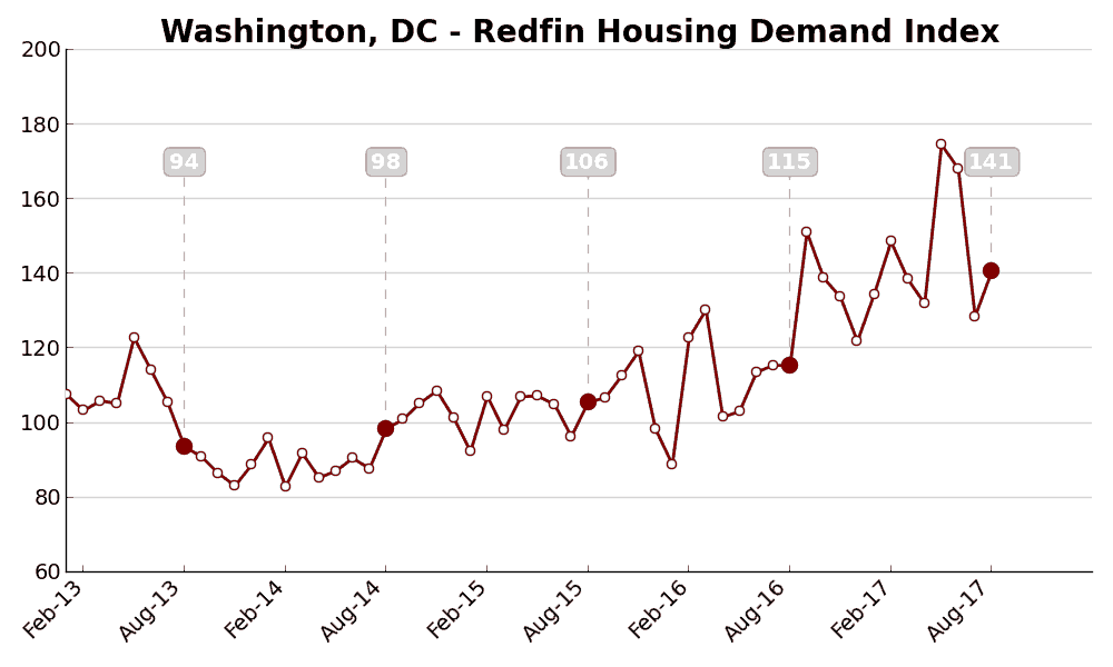 The Demand Index is based on thousands of Redfin customers requesting home tours and writing offers. A level of 100 represents the historical average for the three-year period from January 2013 to December 2015.