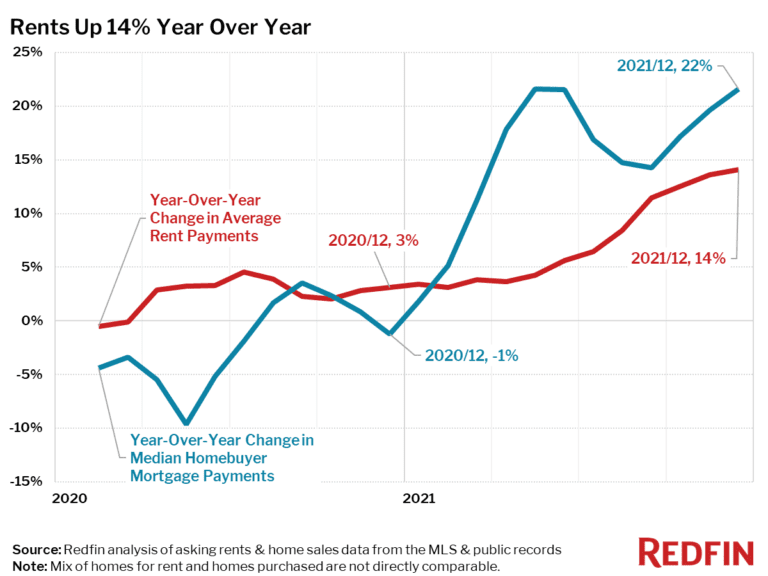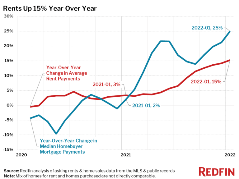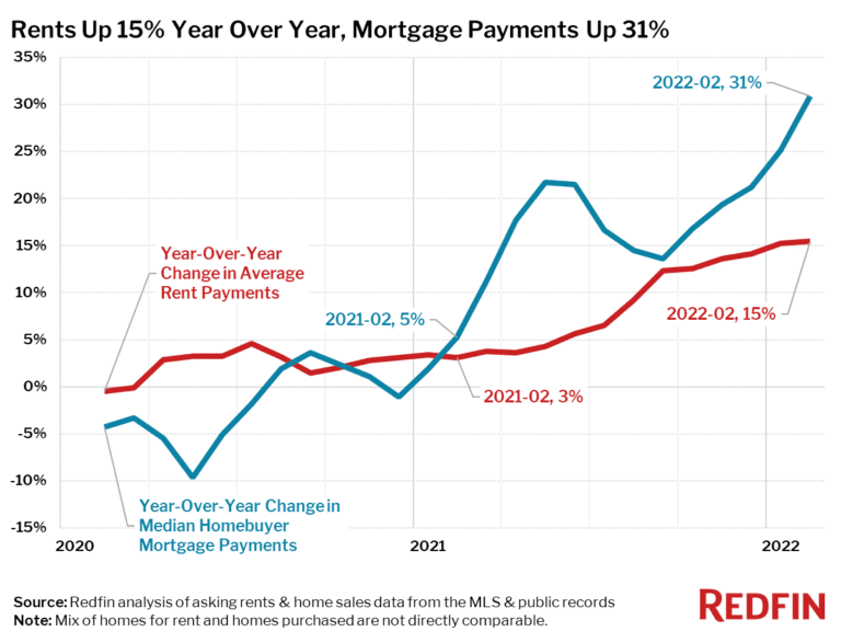 Nationally, asking rents were up 15% in February, while homebuyer mortgage payments increased twice as fast.