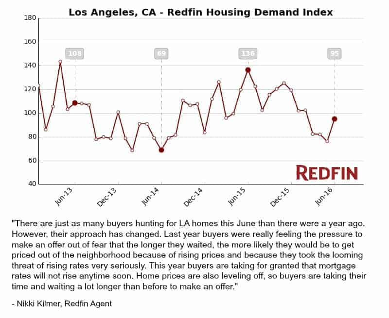 The number of Redfin customers requesting tours in June was up 9.2 percent year over year, the smallest increase in tour activity seen since August 2014. Customers requesting tours fell 6 percent from May. Seven percent fewer people wrote home-purchase offers in June than did a year earlier and there was a 5.6 percent drop in offer-writing activity from May.