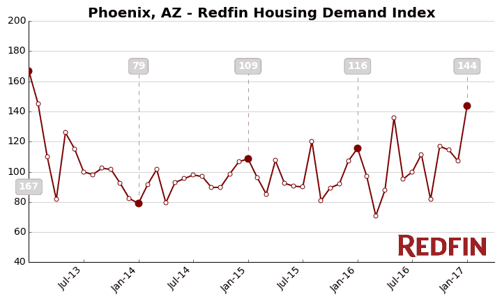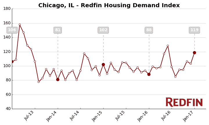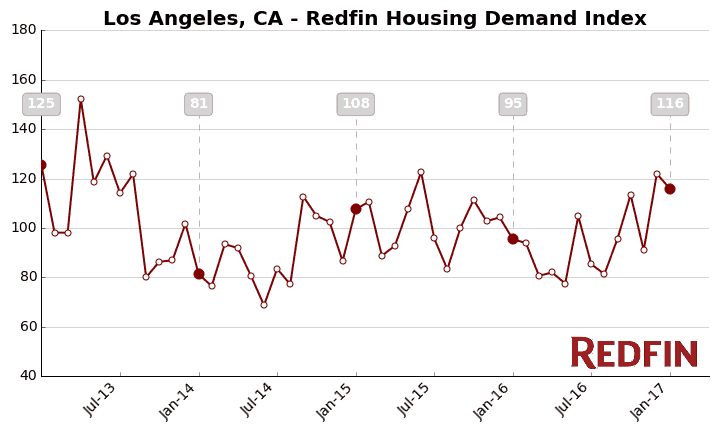 The Demand Index is based on thousands of Redfin customers requesting home tours and writing offers. A level of 100 represents the historical average for the three-year period from January 2013 to December 2015.